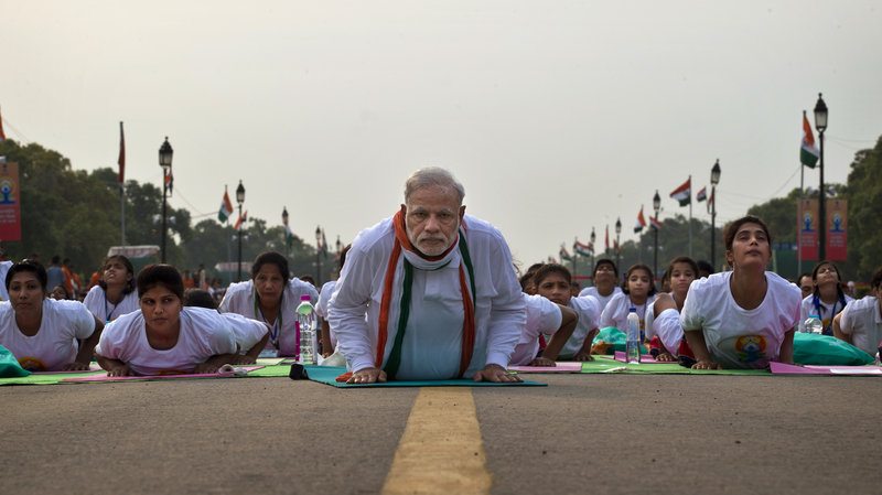 Who would have imagined a Prime Minister of India lying in the middle of the road (the yellow traffic line is visible) on a yoga mat doing yoga asanas with the aam janta, an image which would be flashed across the world for all to see?