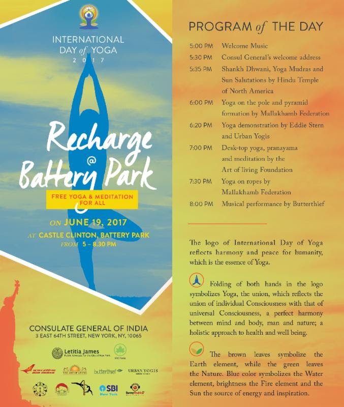 The Consulate’s flagship IDY Yoga event called ‘Recharge @ Battery Park was scheduled to be held today (19th June,2017) from 5 pm till 8:30 pm. However, US National Weather Service has predicted severe thunderstorm and flooding in New York City this evening. The Battery Park Authorities have advised cancellation of the Yoga Event which was scheduled to be held this evening.
