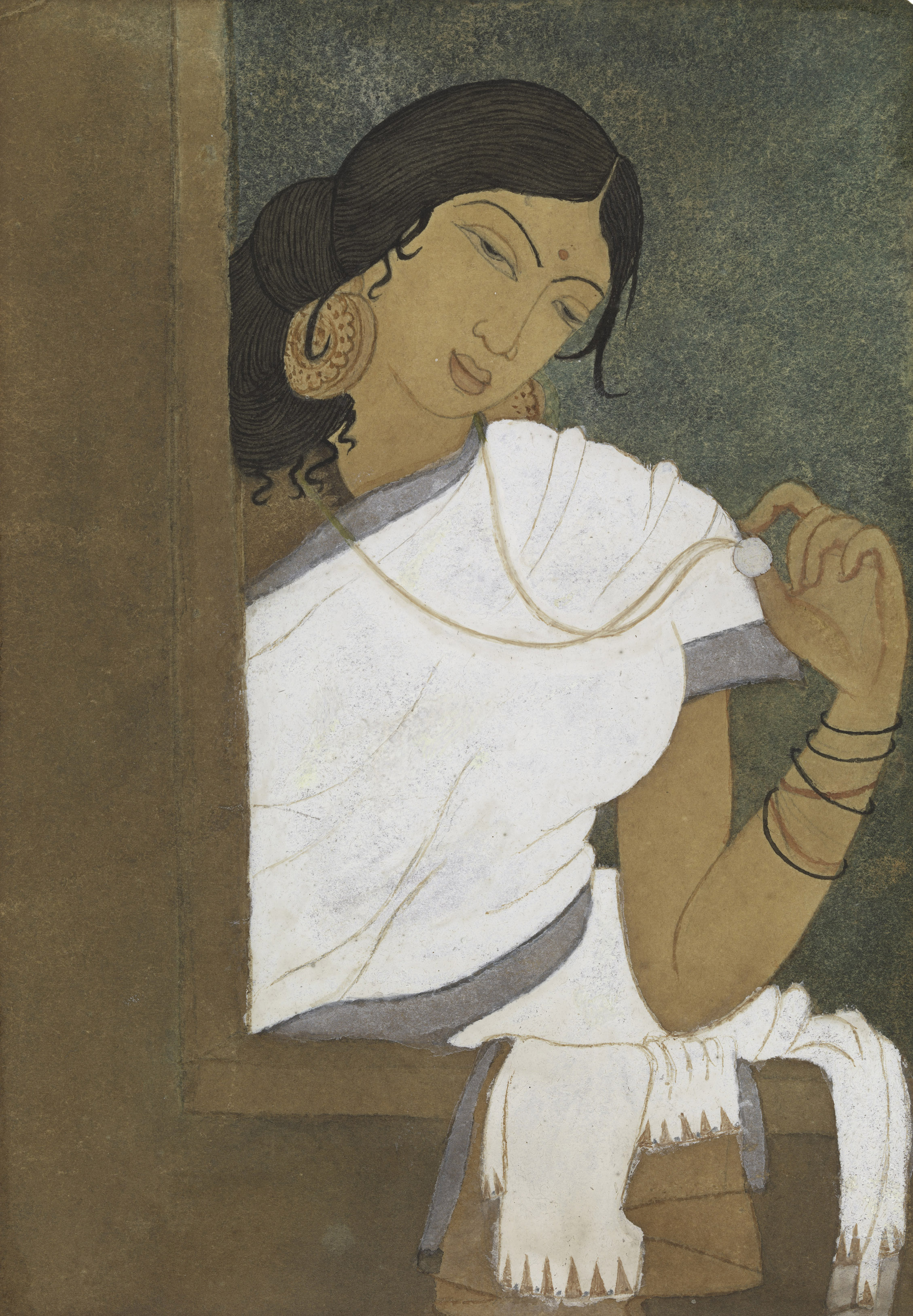 As Guy points out, “Srimati’s painting displayed a consistent commitment to her vision of an Indian style. She explored themes from Indian religious epic literature and scenes of rural culture, asserting traditional subject matter as part of a conscious expression of nationalist sentiments; her choice was personal and idiosyncratic… Through her highly controlled and softly modulated use of watercolor washes, Srimati built on the poetic and lyrical styles developed a generation earlier in India by Abanindranath Tagore and Nandalal Bose.”