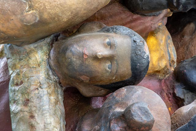 Imagine meeting your saree-clad ancestor in Central Park! And not only is she 18 feet tall but has a cluster of heads in her hand! For a minute I was confused – was this meant to be the Goddess Durga, with the Pujo season as well as Diwali around the corner. But no, her face was too benign to be Durga, and the heads bunched up in her arms were equally benign, not the skulls of evil-doers that the Goddess would have harvested. All around, every-day Americans were going about their park activities – talking, cycling, jogging and skateboarding. Not an eyebrow was raised or a question uttered – this huge saree-clad sculpture blended right into the life and times of Central Park, with babies and dogs and fast food vendors.