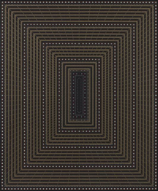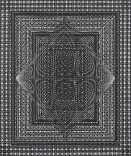 This mesmerizing image by the artist Anil Revri is called Ram Darwaza – and you wonder why.  “These works pay homage to my mother. A leading exponent of the classical Indian Dance forms of Bharat Natyam and Kuchipudi she had, in her final days, expressed a great desire to be able to enter into one of my geometric compositions, and, accompanied by Lord Rama, dance her way into the distant horizon.”