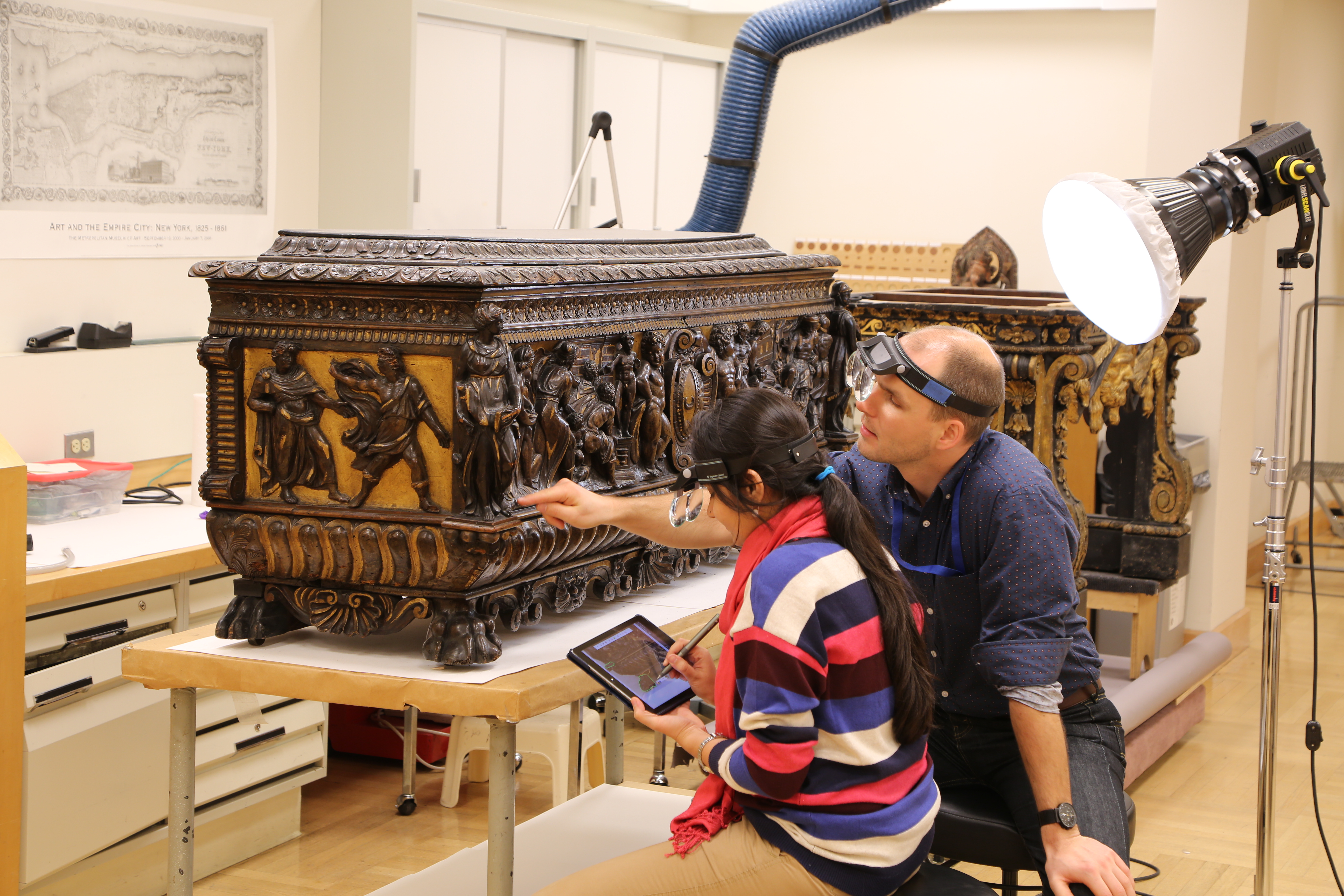 1.Nidhi Shah—ChhatrapatiShivajiMaharajVastuSangrahalaya (CSMVS), Mumbai—with furniture conservator Daniel Hausdorf, while documenting the condition of an Italian mid-sixteenth century carved and partially gilded cassone with nineteenth century additions. She divided her residency between the Metropolitan Museum and the Stichting Restauratie Atelier Limburg (SRAL) in the Netherlands. As part of her program for professional training, “Systems and Procedures for Art Conservation,” Ms Shah developed a template for tablet-based digital documentation.