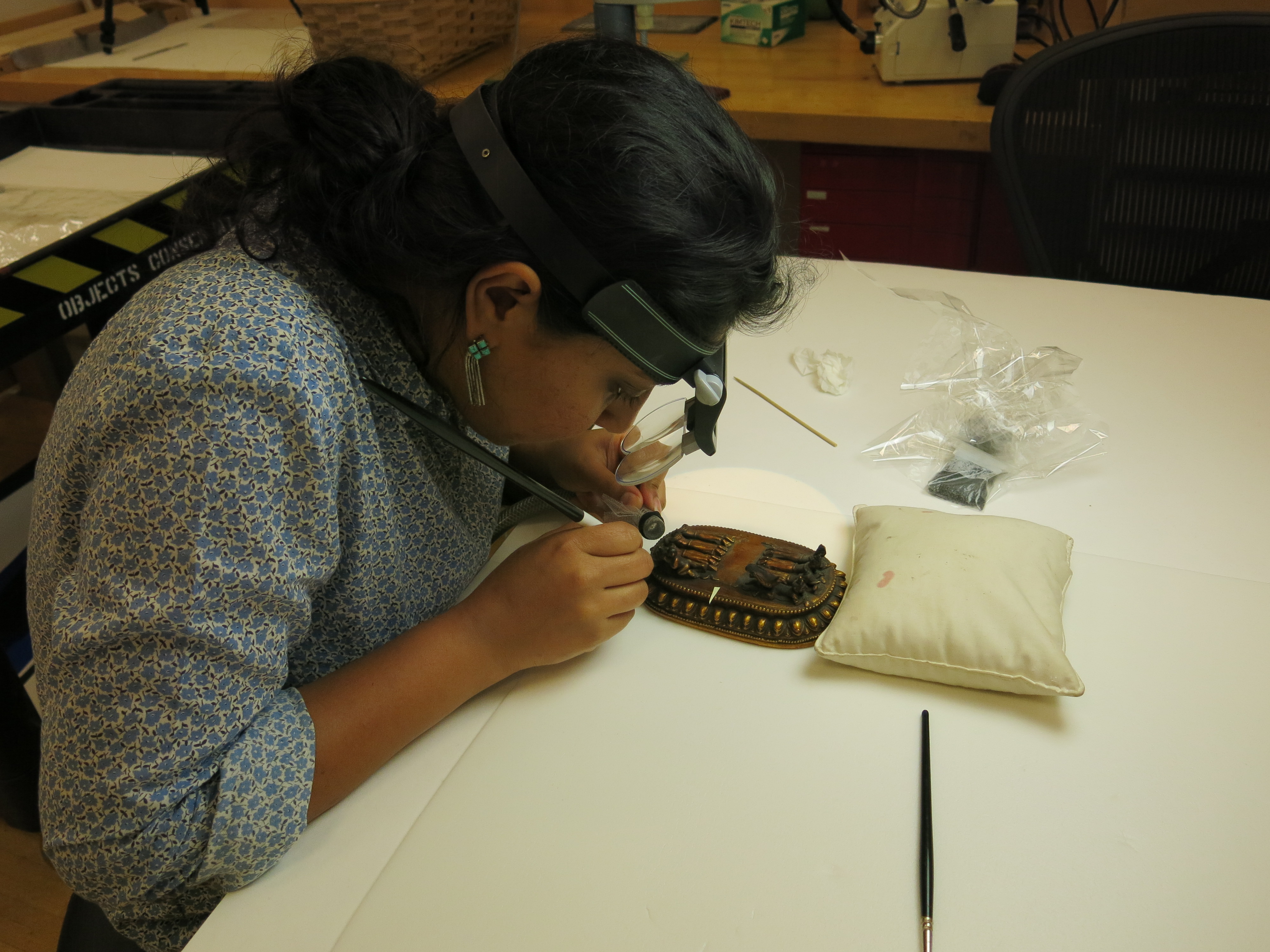 2.Mandira Chhabra—formerly ChhatrapatiShivajiMaharajVastuSangrahalaya (CSMVS) and Himalayan Society for Heritage and Art Conservation, Mumbai, currently graduate student at the Courtauld Institute, London—while examining the base of a gilded and painted stucco figure of Vajrabhairava from Mongolia. During her tenure at the Metropolitan Museum, Ms Chhabra focused on decorated surfaces, incorporating both high and low tech investigative methods for examining, documenting, and treating Asian works of art.