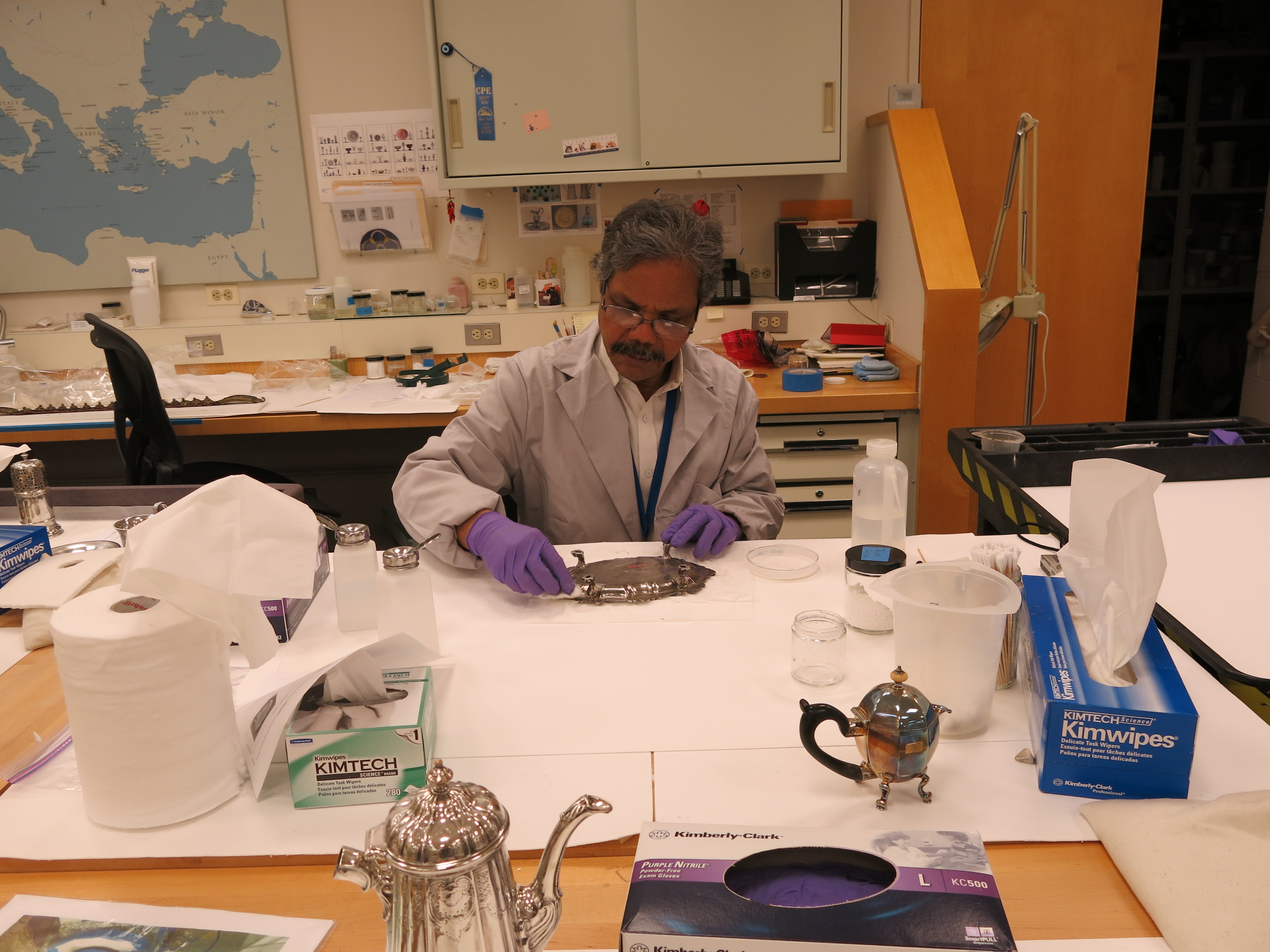 Kailas Abhiman Humane–Salar Jung Museum, Hyderabad—Mr. Humane, a chemist by training who heads up the Chemical Conservation Laboratory for a large and diverse collection, learned mechanical methods for cleaning historic silver, which are more easily controlled than chemical treatments. Here he is cleaning a silver tray by the Britain silversmith Paul de Lemarie.