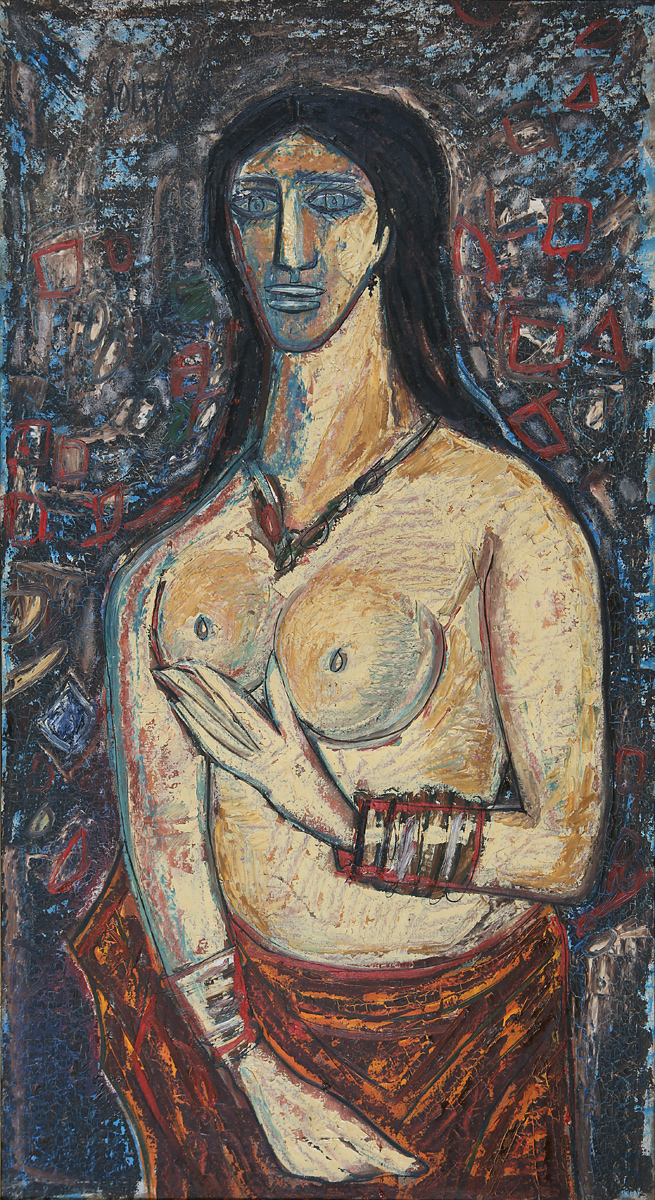 Surprisingly there’s even a spiritual element to the naked or nude body: Untitled (Ceremony) by Bikash Bhattacharya shows the face with a golden glow which has a peaceful Zen shading to it and the sexless body is merely a vessel, almost an empty container.