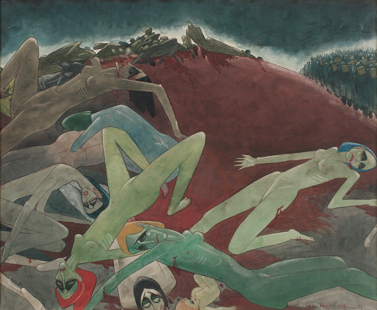 “Nakedness, however, is different from the nude,” writes Kishore Singh, author of the accompanying book of essays and images. “Artists represent the unclothed body to represent that which is real. Victims of violence, hunger and other deprivations are shown in their naked, therefore vulnerable, or abused, state. Here, the intention is not to be voyeuristic but realistic. But many artists also simply use the human figure as part of a larger narrative in which the body, if clothed, would create discourses that could distract from the artist’s intention of merely suggesting a form while building up a tale.”