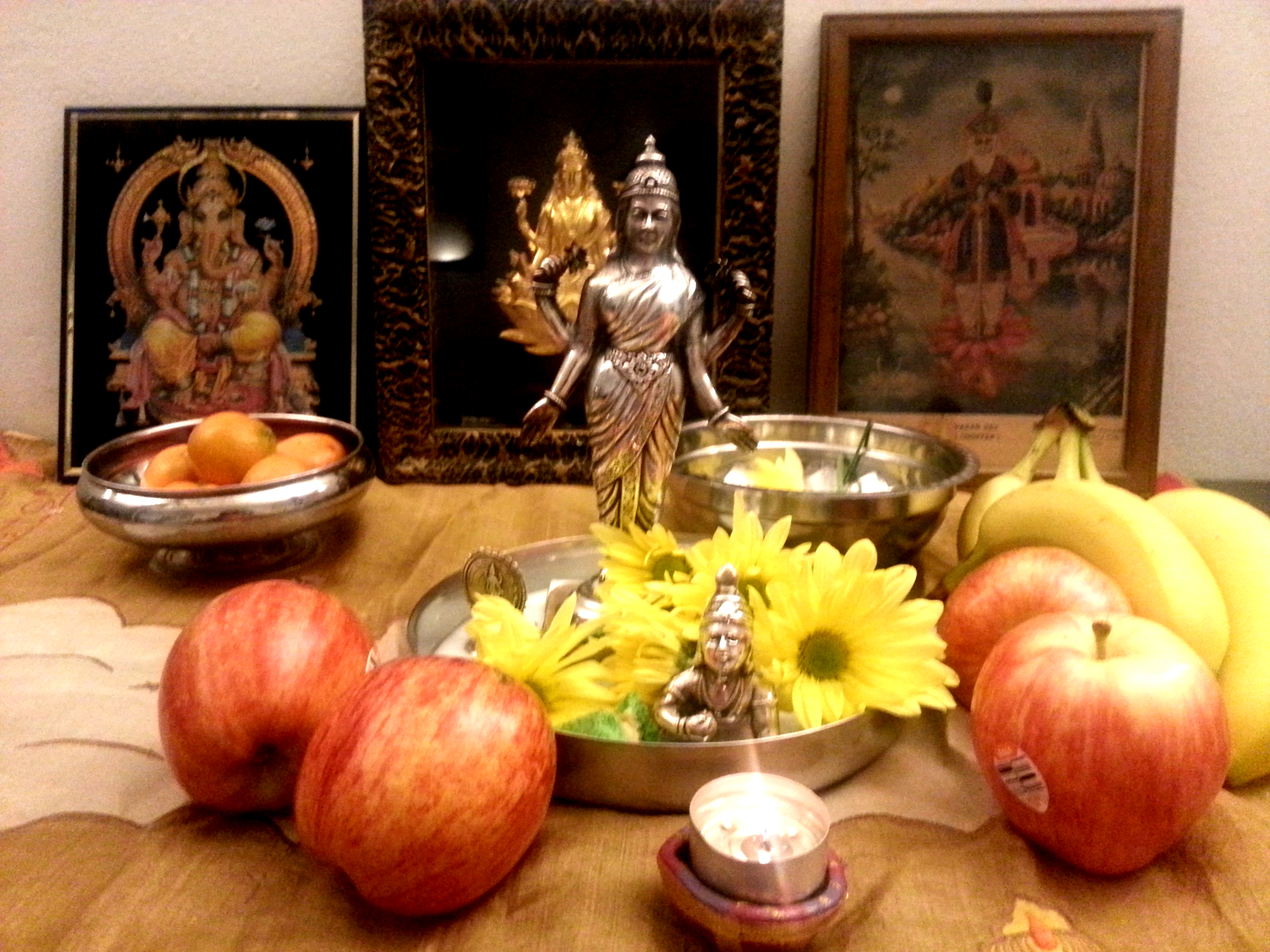 The silver Lakshmi is from my dad’s collection; the gold Lakshmi in an ancient frame is at least 80 years old and from the Melwani clan as is the Jhule Lal image from pre-partition. The little Krishna was given to me by an older sister. The apples and bananas are from America’s bounty. The earthen diya was carted back from the homeland, India.
