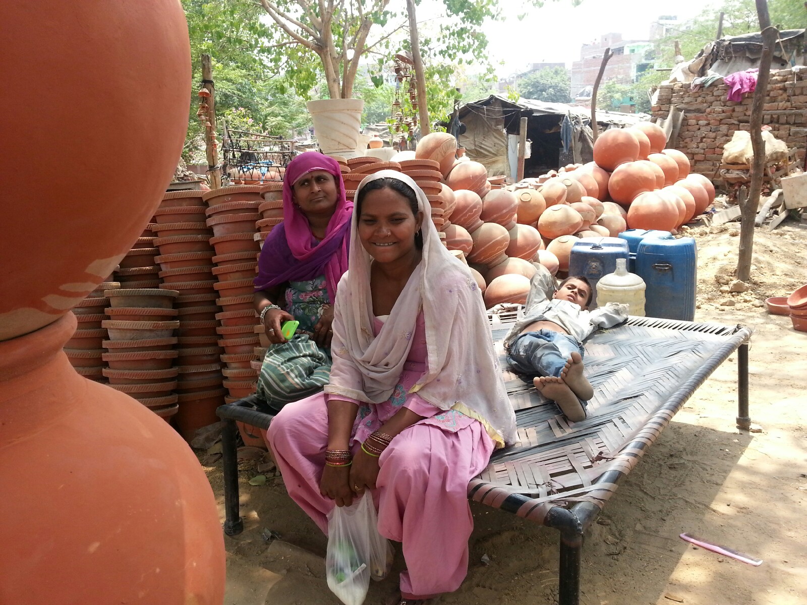 [dropcap]I[/dropcap] went to small neighborhoods and discovered several different families still practice this ancient craft. I’m happy to report that while I was at one small makeshift store, the potter’s wife stood outside on the road to collect her uniformed grand-daughter from the school bus and take her in, unloading her heavy school bag. In another location,  the potter’s daughter came running to show me the wares while the women of the family rested on a string bed right out in the open as cars whizzed by on the busy Delhi street. There was a sea of clay vessels as far as the eye could see.