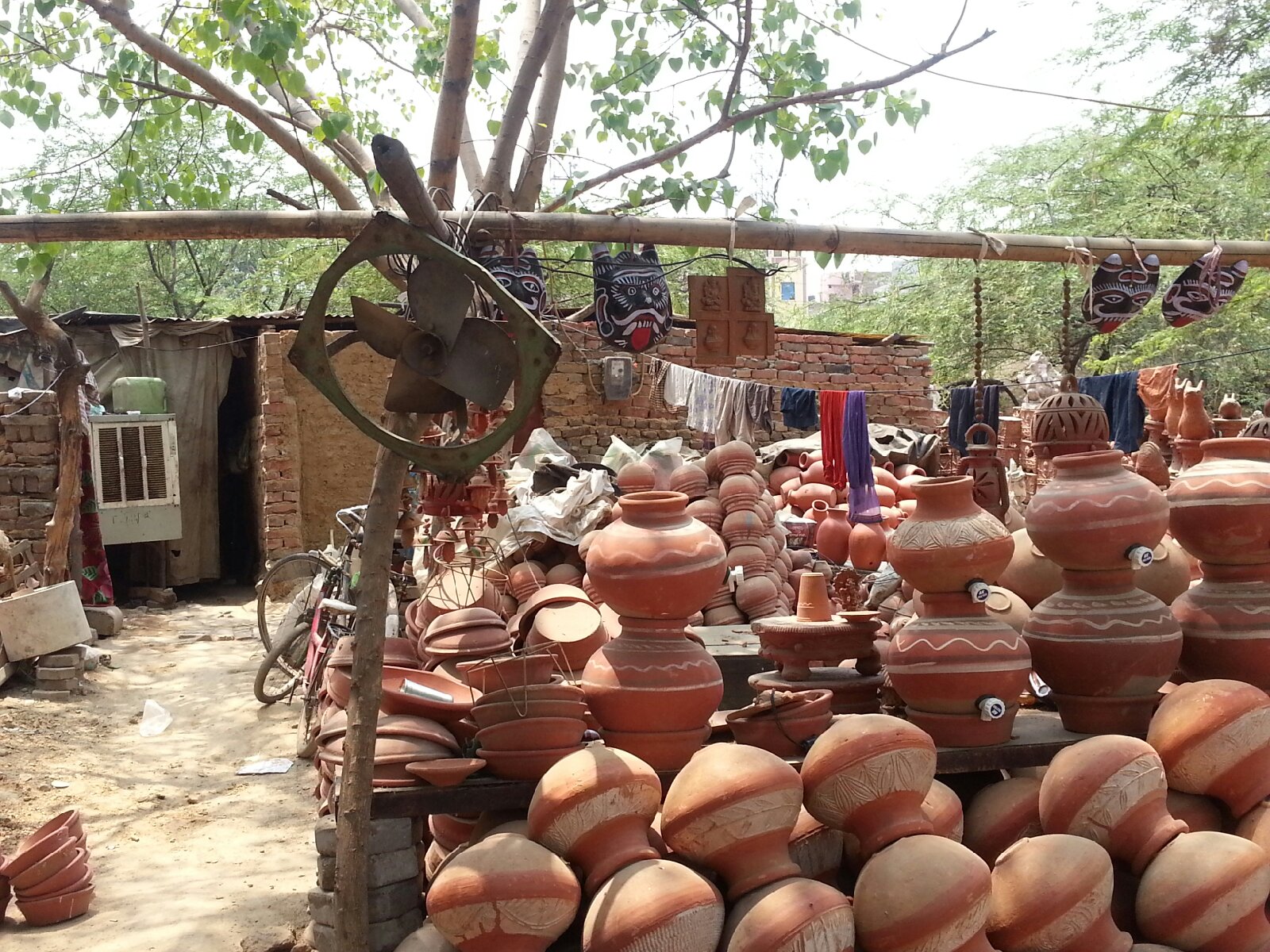 The family had an air-cooler for their ramshackle brick home and a scooter stood tethered close by, the new electric horse in urban India. Around them was a field of clay utensils. Did she go to school I asked the young pots saleswoman anxiously. Yes, today was a holiday she smiled as she showed me different pots or handis to make a biryani in. I was also amused to see the women of the family, their heads covered,  browsing a mobile phone on the charpoy. People just like us, and probably on Facebook! One wonders if their children, with so many opportunities in urban India, will continue to make utilitarian pots out of clay – or is it a dying art?
