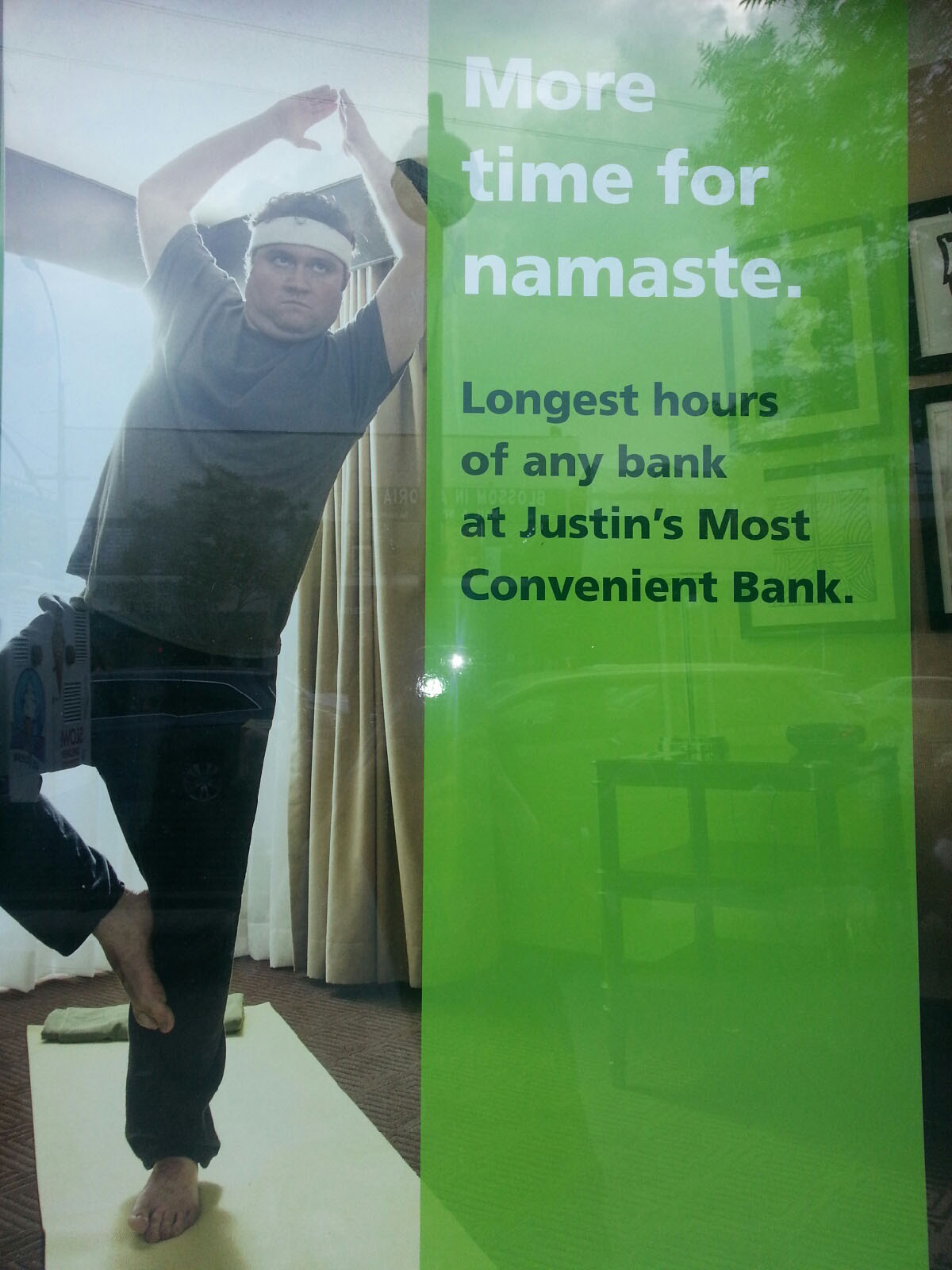 [dropcap]A[/dropcap]s I go for my daily walk up the avenue, it somehow gives me a sense of ‘apnapan’ or belonging, of ownership, of it being my city. Yes, there is even yoga – with Americans still trying to get the hang of it. I always pass this poster in the window of a bank, of a white male trying to do a surya namaskar or ‘namaste’ as the sign calls it. I just have to smile when I see it!