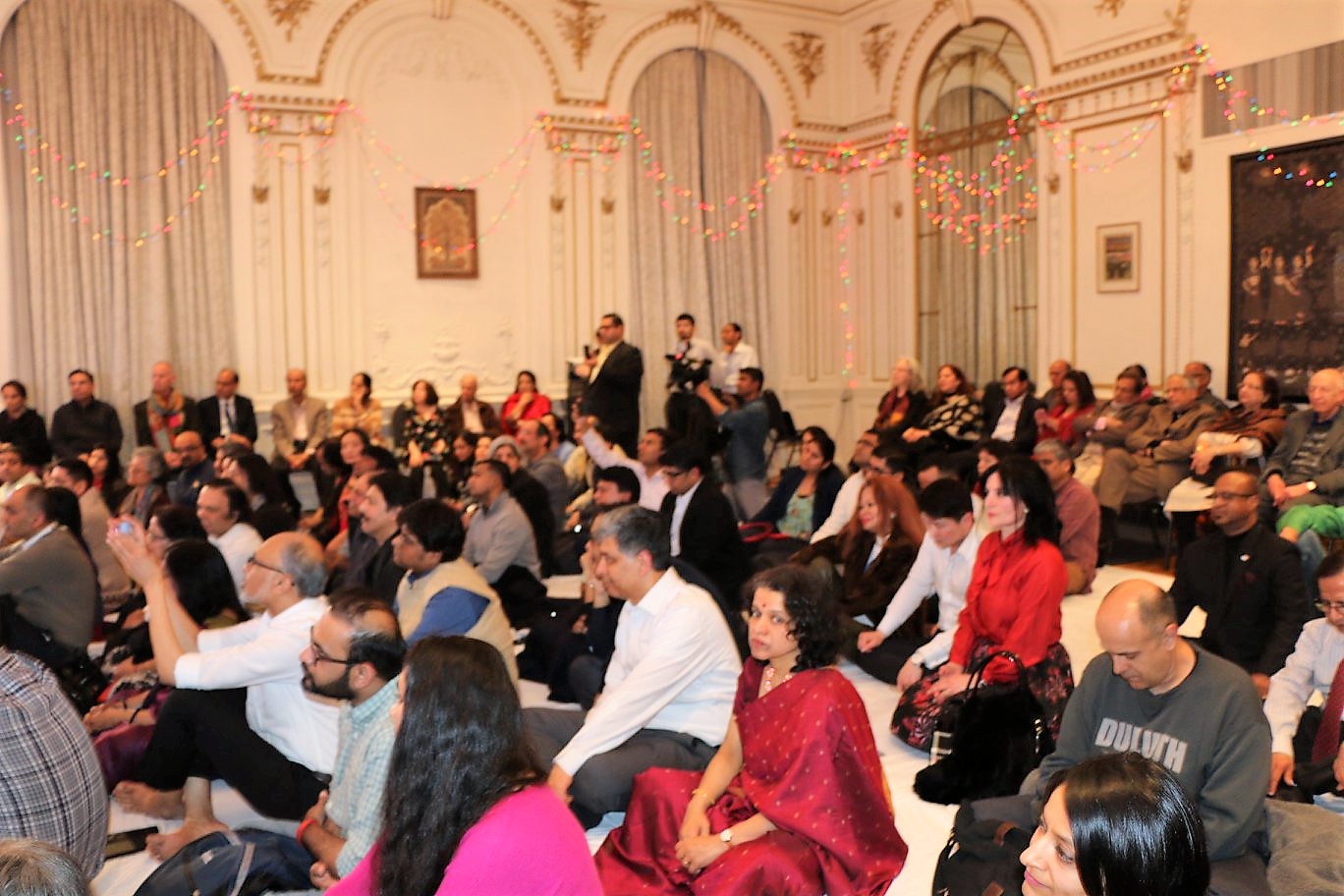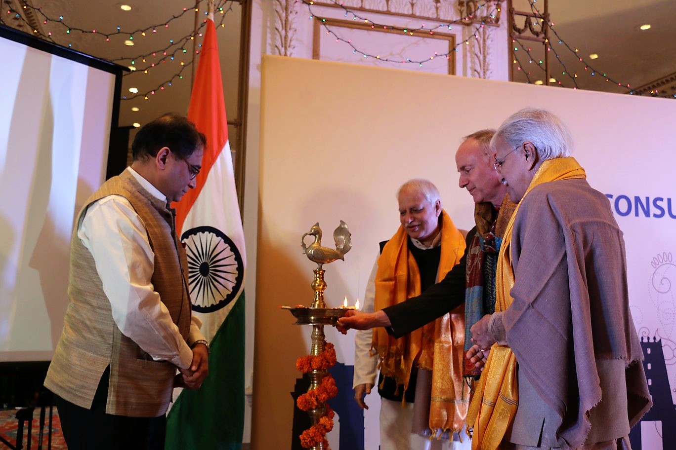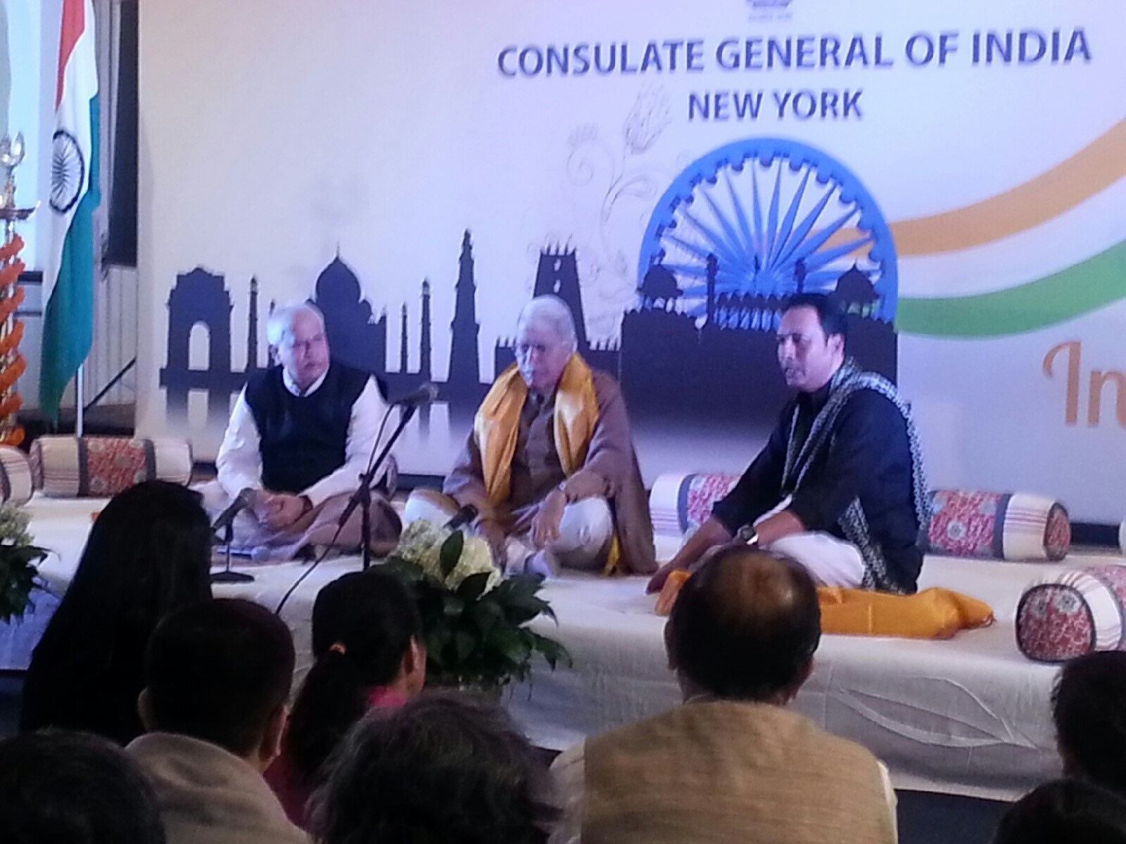 [dropcap]S[/dropcap]ometimes unrelated events can be the source of inspiration and creativity. The musical gathering or Baithak arranged by Sandeep Chakravorty, Consul General of India, at the Indian Consulate in New York provided an opportunity for Indian classical music lovers to gather in an intimate setting for a conversation with the legendary brothers, Pandit Rajan and Sajan Mishra of the Benares Gharana. Over a hundred people thronged the ballroom, listening to this informal and delightful dialogue between two musical greats. They were joined by the Maestro Hidayat Hussain Khan who moderated the conversation and added many insights and memories about the musical life.