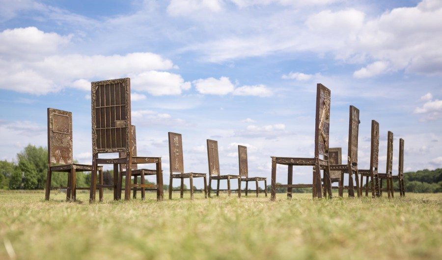 It has been commissioned by Surrey County Council and National Trust, and features 12 chairs, each honoring a noted figure. Here is a description of the work: “Twelve intricately worked bronze chairs stand together on this ancient meadow. Each chair incorporates symbols and imagery representing concepts of law and key moments in the struggle for freedom, rule of law and equal rights. The Jurors is not a memorial, but rather an artwork that aims to examine the changing and ongoing significance and influences of Magna Carta.”