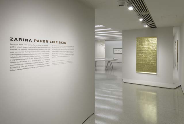 “Paper, with its extraordinary range of tones and textures, forms the core of Zarina’s continually evolving and distinctly independent oeuvre,” says Allegra Pesenti, curator of the retrospective. “With it she expresses the cultural diversity that marks her persona and the notions of boundary, loss, displacement, and home that underlie her abstract vocabulary. Paper has a seemingly fragile surface, yet it supports her manipulations and bears her most vital messages.”