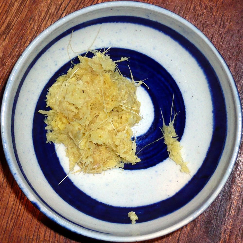 * When finely grated ginger is required, it should first be peeled and then grated on the finest part of a grater so it turns into pulp. When a recipe requires that 2.5 cm/I inch of ginger be grated, it is best to keep that piece attached t the large knob. The knob acts as a handle and saves you from grating your fingers.