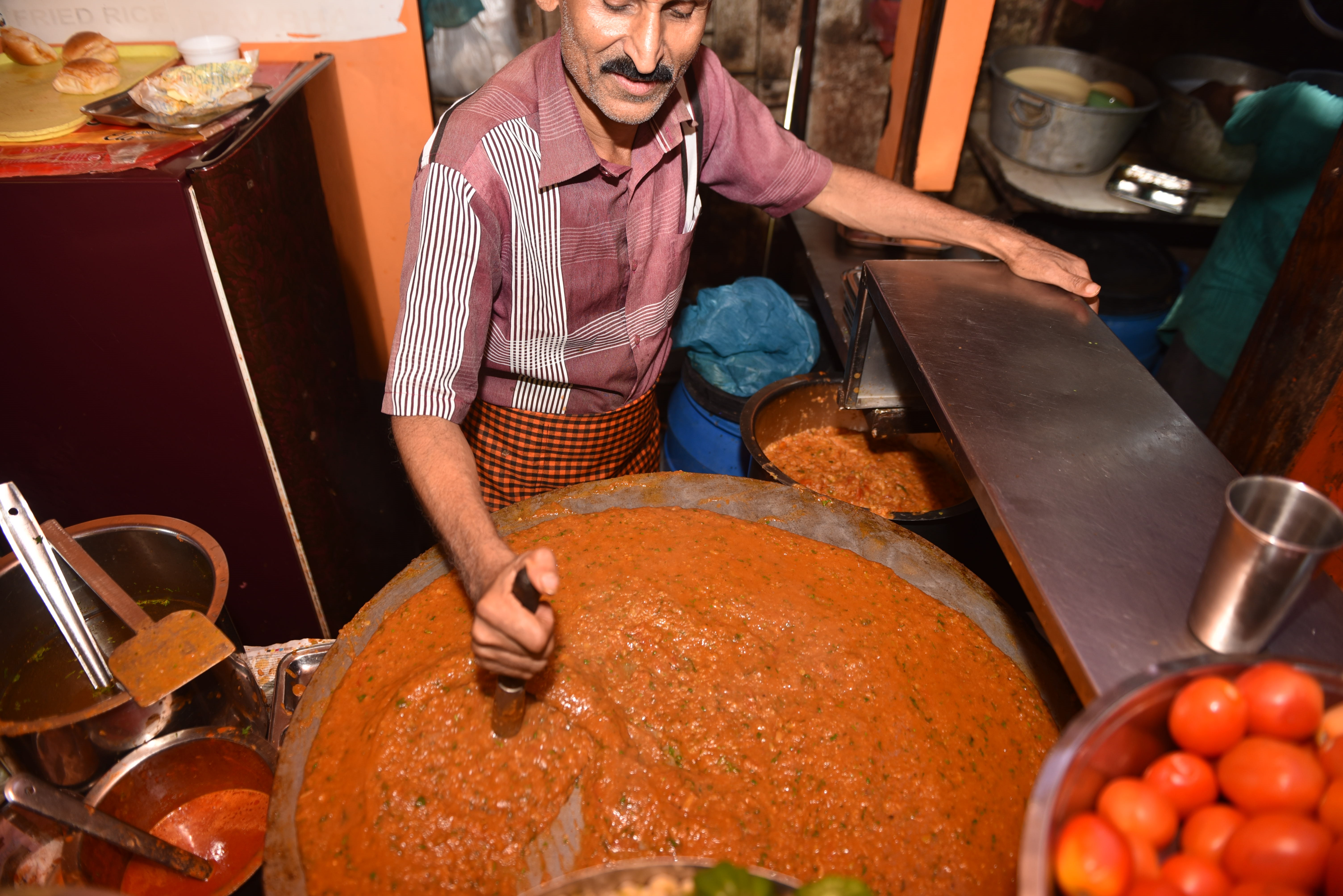 The Khau Galli is mind-boggling in the variety with scores of makeshift stalls right next to each other. There’s even a Lenin Pao Bhaji stall! It’s the owner’s real name – he’s from Kerala and the bustling stall not only sells pure veg pav bhajji by the gallon but also make pure veg Chinese fried rice and noodles! I love the enterprise and creative thinking of these street vendors! By catering to varied tastes, they have a captive audience of laborers, office workers and students.