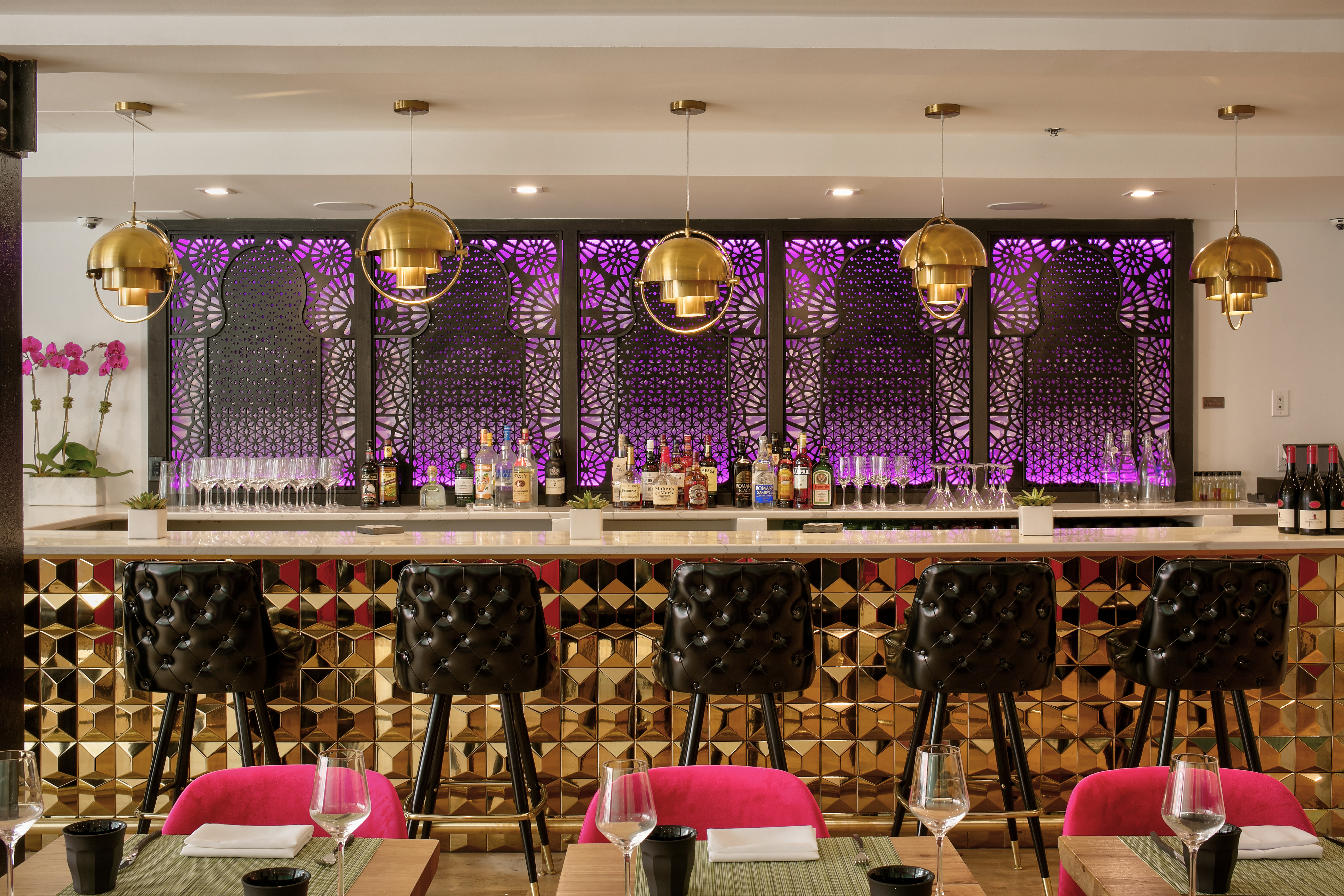 [dropcap]H[/dropcap]emant’s winning combination includes many innovative small plates which seem to be what diners want nowadays for a casual meal, more than the whole nine yards of a full desi meal. The bar is a sleek combination of black and brass accents. The ambiance is understated with pink floral wallpapering and black leather seating – indeed, the décor does not give away any clues to what the food would be, unless you consider the deep Indian pink of the restroom to be a giveaway!