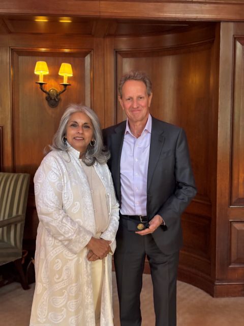 In New York anything is possible, and you may find yourself rubbing shoulders with the likes of Deepak Chopra, Chandrika Tandon and Fareed Zakaria and some very stimulating and high-powered guests at a private book party hosted by Carol and Timothy Geithner. The celebration was for the launch of Meenakshi Ahamed’s thought-provoking book ‘Indian Genius: The Meteoric Rise of Indians in America’. At this sparkling event, she had a conversation with Andrea Elliot, Pulitzer award-winning NYT journalist and author of ‘The Invisible Child’.