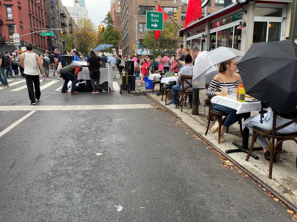 The side streets were closed to traffic so kids had the run of the space, playing ball and simply strolling about in a golden haze of childhood, with no traffic lights or cars to worry about. Cafes and bars had pulled out their outdoor tables and people enjoyed front row seats to the marathon with their side of pizza and beer. And when a light drizzle began to fall, spectators whipped out umbrellas and just kept on rooting and the runners – they just kept running.