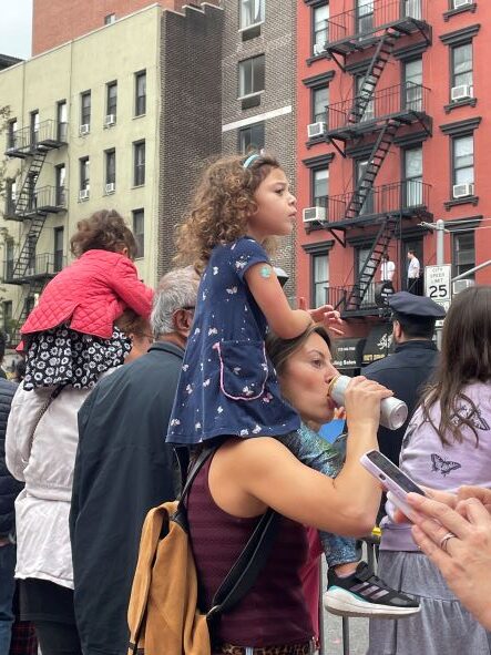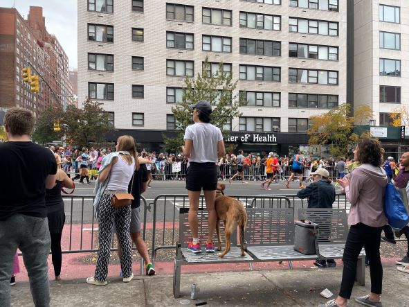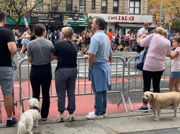 What I saw were determined runners of every age and a community cheering them on with chants, claps, music, placards and their very presence. New York came alive as a caring community, a strong neighborhood and a fabric built of real people. Babies and dogs were everywhere and so were three generations of families, all cheering and clicking their phone cameras.