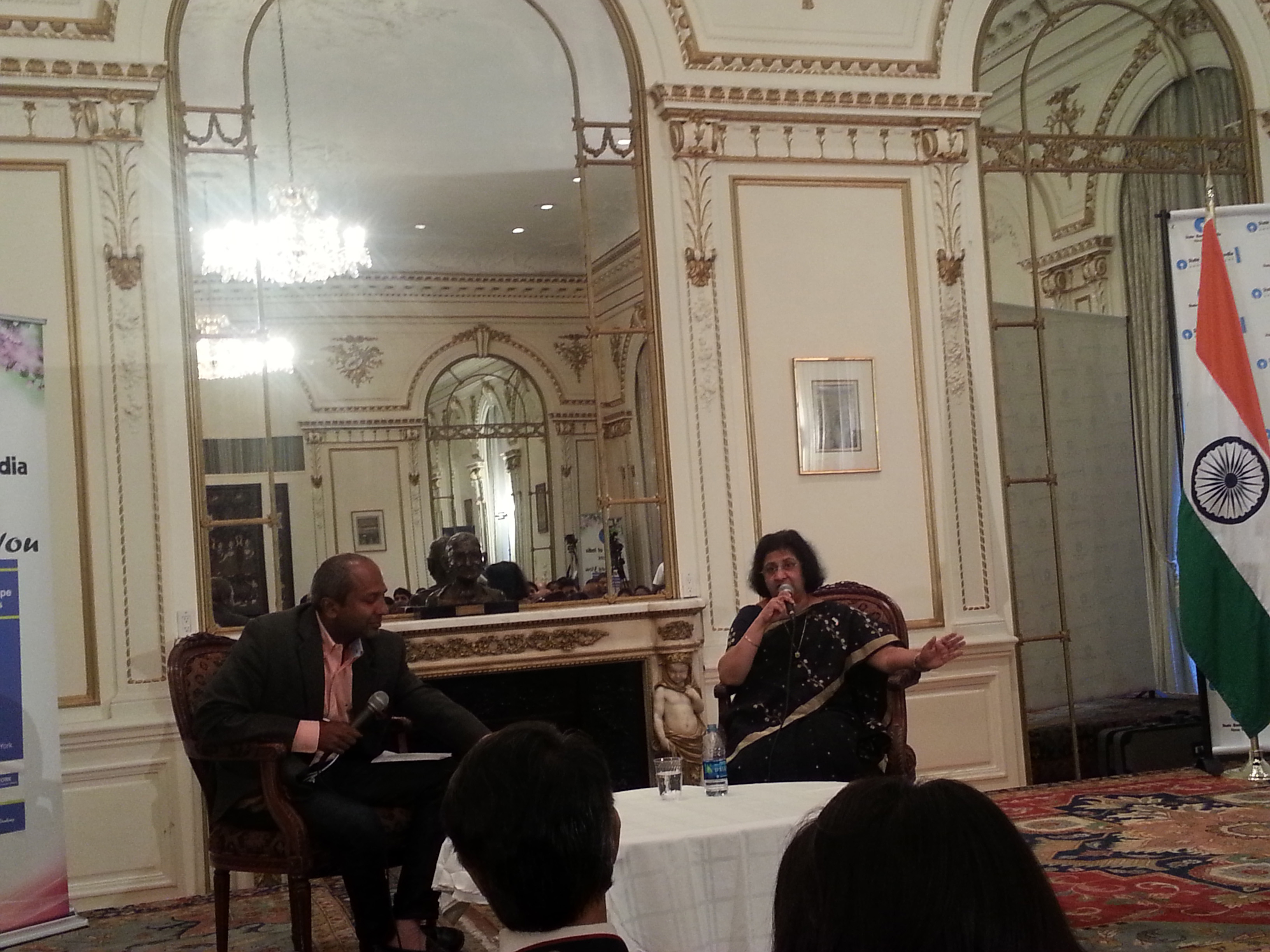 [dropcap]A[/dropcap]h – technology! It sure gives you options. When the powerful State Bank of India Chairman, Arundhati Bhattacharya, came to New York people heard her ground-breaking ideas and thoughts in different ways. Some came to the Indian Consulate and heard her speak in the beautiful ballroom of the townhouse. This event was hosted by the Consul General of India Ambassador Riva Ganguly Das with the State Bank of India in collaboration with TiE. This was followed by a Q and A and a desi dinner.