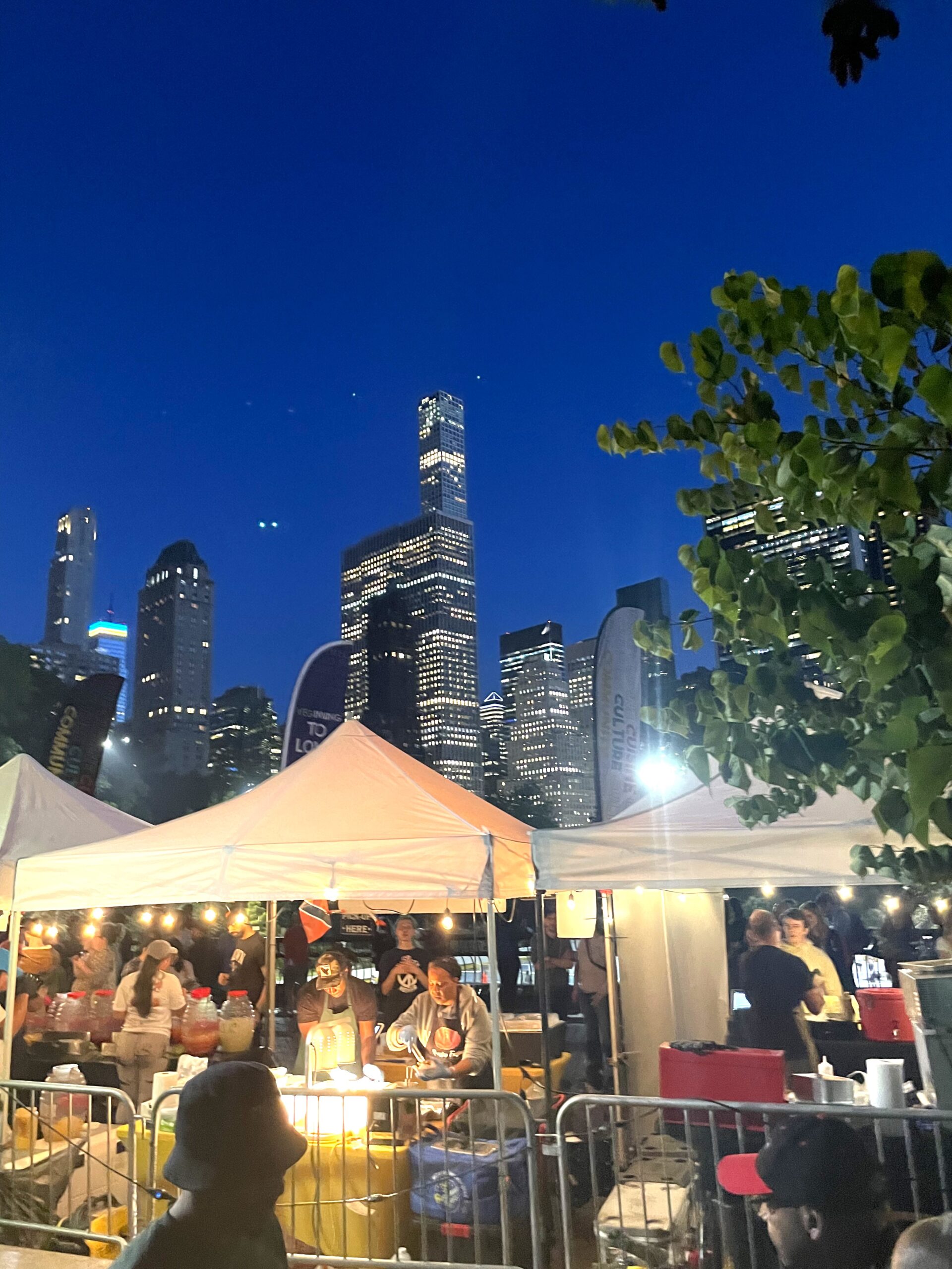What can be better than eating outdoors, under the stars on tables set up on the grass? And with the glittering skyscrapers of Manhattan as the backdrop!