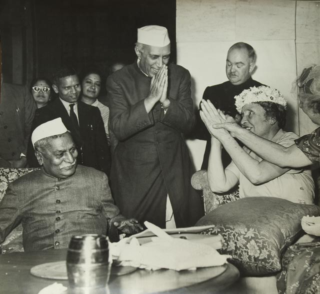 Dr. Helen Keller, who was calling on President Dr. Rajendra Prasad at the Rashtrapati Bhawan, being greeted by, Prime Minister Nehru who had come to see her Homai Vyarawalla India; 1955 Alkazi Collection of Photography