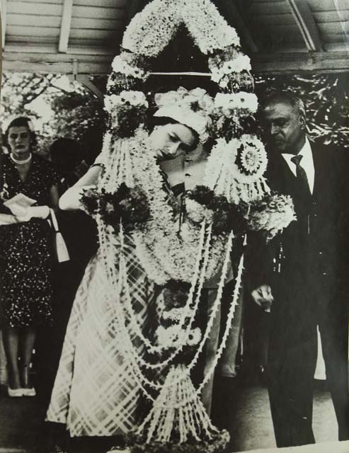 Homai Vyarawalla, Indian (1913 – 2012) Queen Elizabeth II examining a gigantic garland presented to her in Madras; 1961 Gelatin Silver Print Alkazi Collection of Photography