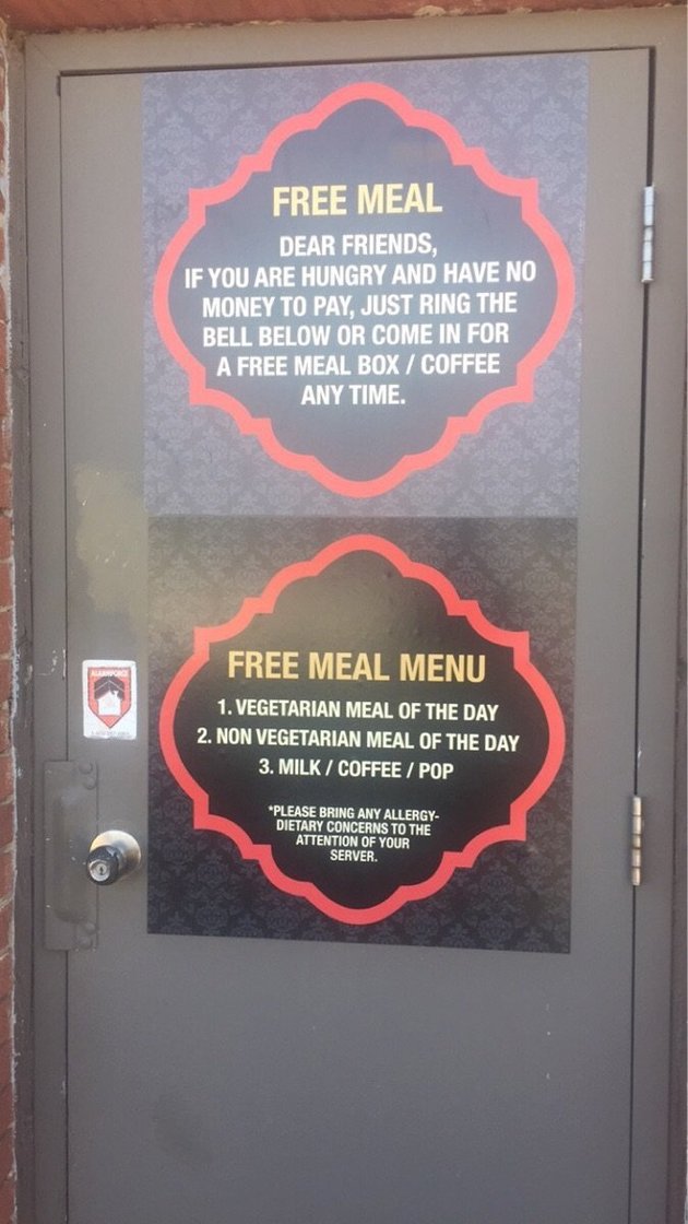 Well, I just came across this story in HuffPo about a Canadian restaurateur who has taken this food dilemma in his own hands – and is feeding whoever needs to be fed. Indian Fusion, a Canadian restaurant in Edmonton, Alberta, has a sign on its backdoor that invites anyone who is in need of a meal to come inside and eat for free:.