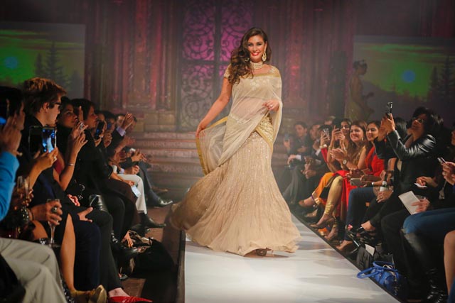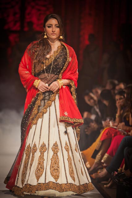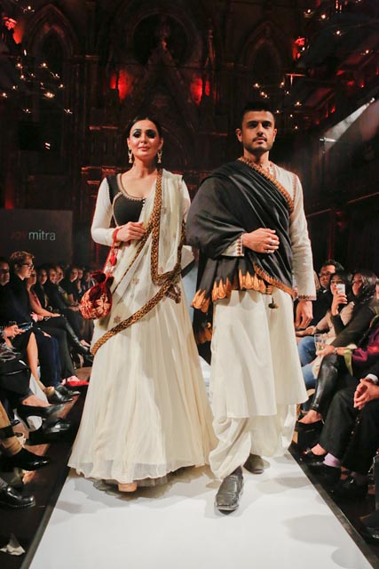 Set against the backdrop of Kolkota, Mitra’s couture evoked the memories of a bygone era. Bollywood actress and India’s “What Not to Wear” host, Soha Ali Khan was the showstopper for the “Chokher Bali” line. The striking, simple yet very definitive touches of old Calcutta materialized on the runway, with ornate zardozi, jacket tops and dhoti bottoms, evoking a beautiful lost world in stark shades of cream, black and gold.