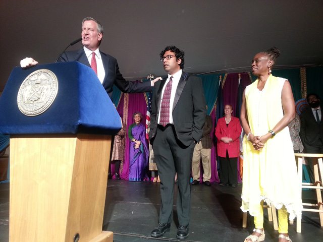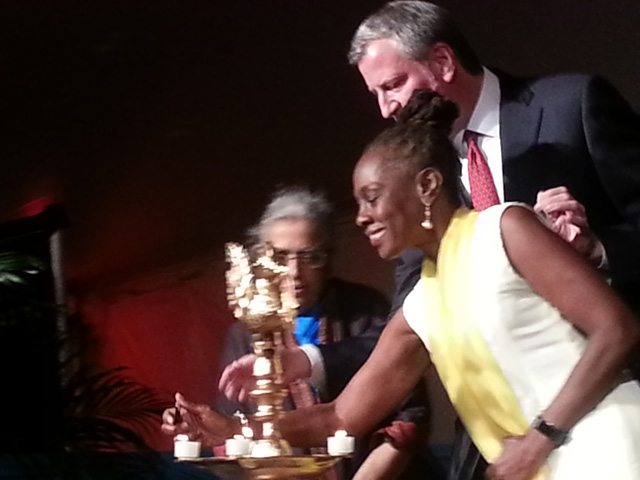 [dropcap]S[/dropcap]ince the last two years New York Mayor Bill de Blasio has been inviting the Indian community to Gracie Mansion for a celebration of Diwali. Hosting the celebration with de Blasio is First Lady Chirlaine McCray who always wears an Indian Punjabi outfit for the occasion. In 2017, the evening began with an invocation Sanskrit prayer officiated by Dr. Uma Mysorekar, president of the Hindu Temple Society, and a ceremonial lighting of the lamps with the Mayor and First Lady who recognized stand up comic Hari Kondabolu by proclaiming it ‘Hari Kondabolu Day’. Kondabolu gave his own funny take on Indian-Americans and life in New York.