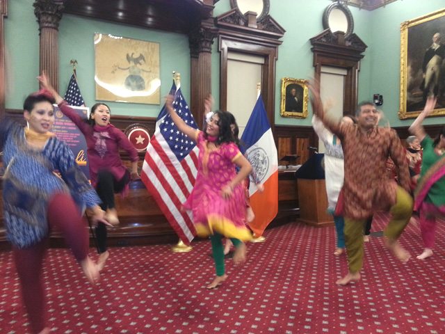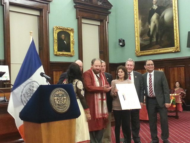 [dropcap]C[/dropcap]ity Hall also hosted a Diwali celebration in its august chambers with New York City Council Speaker Melissa Mark-Viverito and Council Member Rory I. Lancman and several council members during the Diwali season and honored Indian-Americans who have contributed to the larger community. They all gathered around a traditional brass diya stand to light the lamps for Diwali, and Dr. Krishna Pratap said a world peace prayer.
