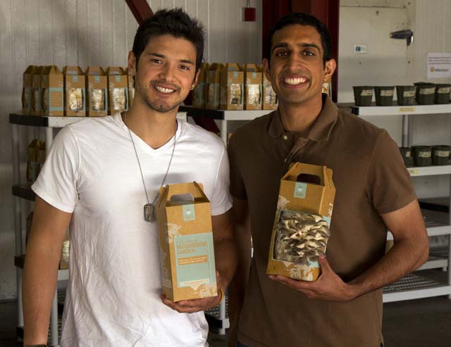 Imagine growing gourmet oyster mushrooms from discarded coffee grounds! Imagine nurturing green herbs in water tanks containing pet fish and their waste! The financial world lost Nikhil Arora and Alejandro Velez , both students at UC Berkeley, who were headed toward careers in investment banking and consultancy – but the environment has gained two creative thinkers who can turn waste into nutrient gold.